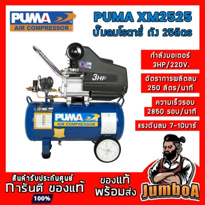 XM-2525 (3HP) ถัง 25ลิตร PUMA | รอบมอเตอร์ 2850 rpm. | อัตราการทำลม 250 ลิตร/นาที | Dimensions (กxยxส) : 31x70x66 ซม.